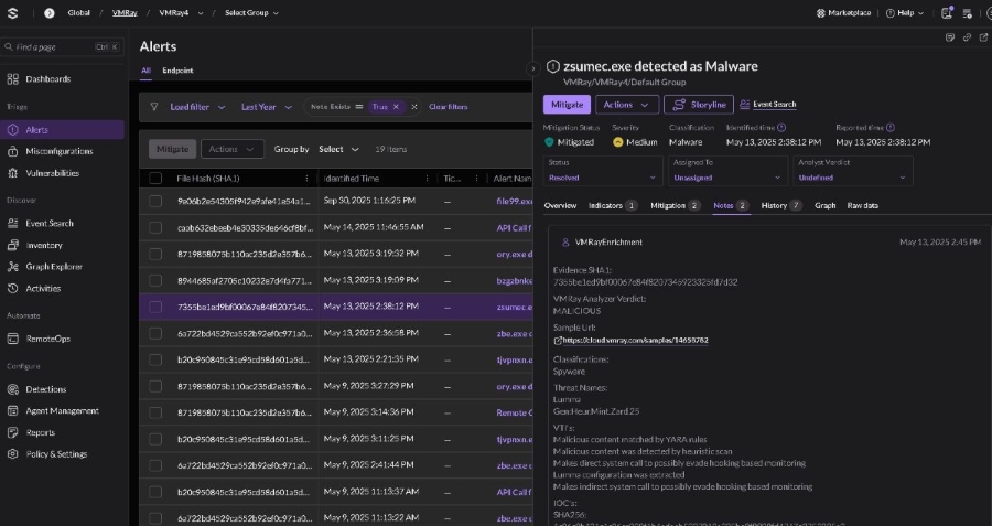 For suspicious verdicts, VMRay deliver the VMRay Threat Indicator directly to SentinelOne alert note as well as a link to detailed report, allowing the analyst to make an informed decision.