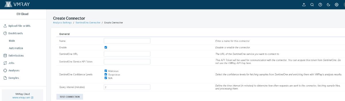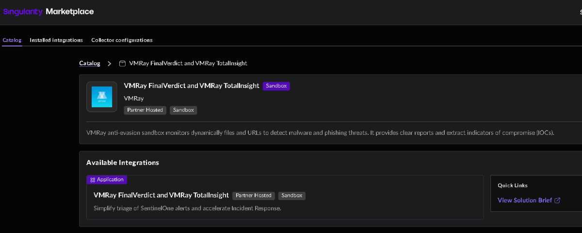 A: The integration is listed in the SentinelOne Singularity Marketplace and can be enabled with your VMRay account credentials.