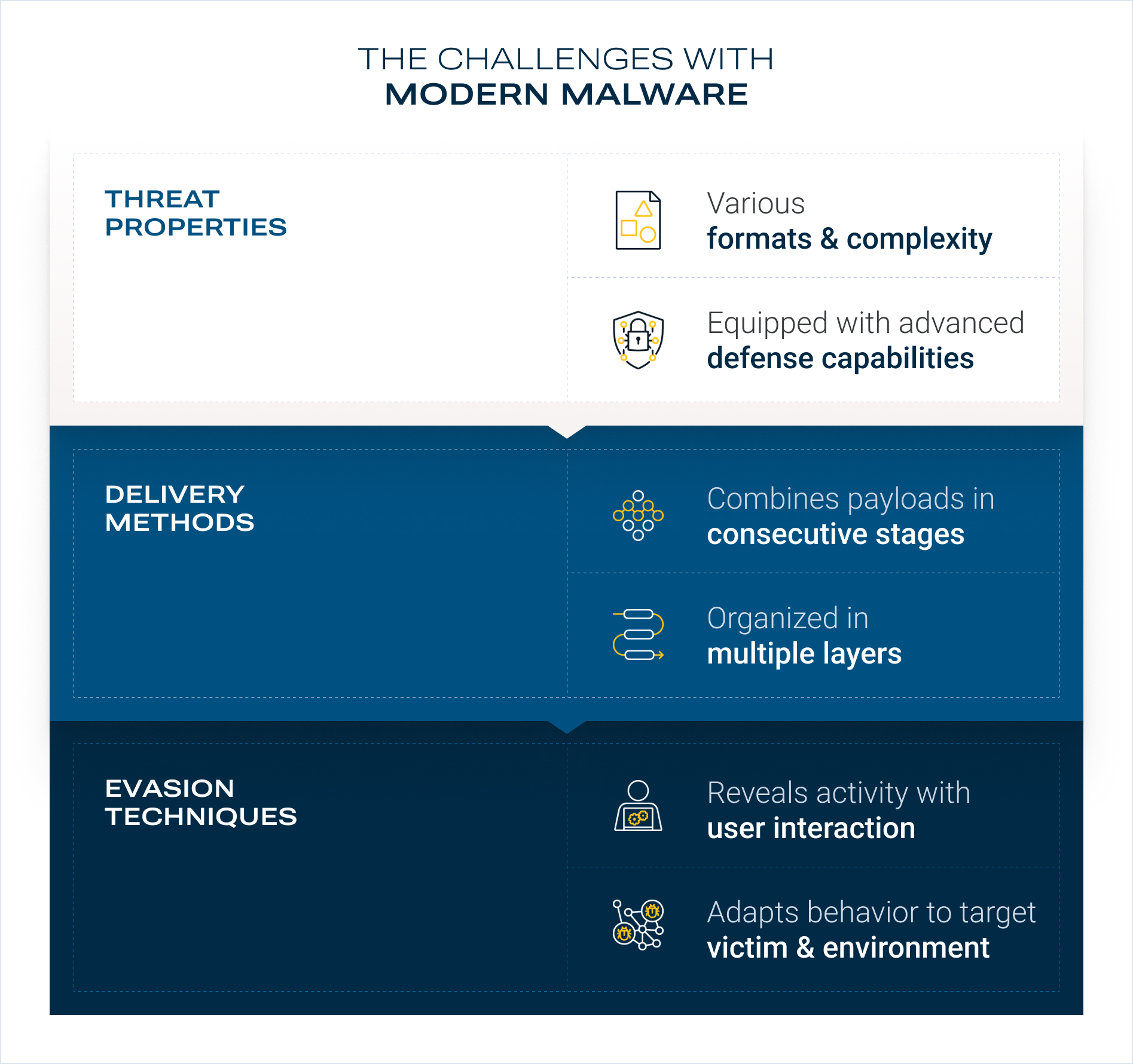 One may get the impression that today we are back to square one, with attackers always one step ahead and reactive defenders always one step behind. This is true only for conventional sandboxing, and the reason is obvious: the underlying technology was designed for non-evasive Windows executables in clearly defined, non-customizable detonation environments. Since the mid-2000s, malware has dramatically evolved. Today, modern malware is very different in multiple ways. It